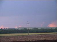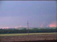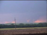 The Weathervine crew and I observed two tornadoes between Concordia and Belleville, Kansas yesterday in the late afternoon. At one point, three massive block wall clouds hung from the updraft base, and we had high hopes for all three, but only one touched down, followed by a smaller and more narrow funnel. We started the day in extreme southeast Nebraska, hoping to take advantage of high helicities from the forecast east winds per the 12Z RUC and ETA. We chased the first storm that fired in Thayer County (again!) and chased it nearly to Beatrice as it morphed and tried to organize. This storm earned a tornado warning and we observed a mid level funnel that was reported as a tornado later. However, this storm was involved in an HP cluster and the mesos were hidden and embedded in heavy rain. We knew about the Concordia supercell since we had good radar coverage, but wanted to stick with the target we'd worked hard to choose. Finally, however, it was obvious this storm would not escape the precip shroud and we dropped south, approaching the Concordia supercell from the east. I observed both tornadoes from the village of Wayne, while Weathervine was closer to the storm having elected to continue west. The circulation I