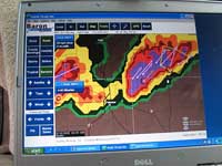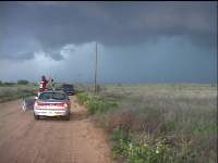 Tony Laubach hears the spotter report of a tornado and points to the shadow ~2354z |
