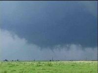 Rain-wrapped tornado behind forward flank gust front |